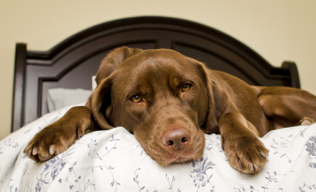 My chocolate boy sleeps through the night right on my bed with me. The thing I feel awful about is while at work 8+ hours he likes to have either my bed, or my daughters, but he has ripped sheets, blankets, and mattress covers so many times he’s been banished from the bedrooms when we are not home. He has an L.L.Bean bed, but prefers “his” love seat with one side reclined, and that’s where he begrudgingly spends my work hours. I always leave the t.v. on for him and if it’s hot a fan – but I still feel absolutely awful when he asks to go in on the bed and I have to tell him no. Wish I knew how to break him of ripping at the bedding – we assume he’s trying to bunch the covers into a “nest-like” spot, but we can’t have him tearing the bedding up, and he’s proven time and time again that he can’t be trusted! 🙁