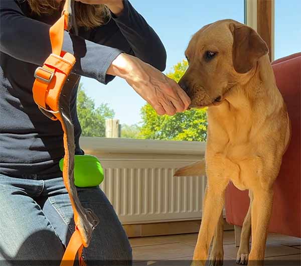The good news is, this is usually a straightforward problem to fix. Our strategy is simple. We do it by using your Labrador’s fondness for food. You’ll be teaching them to accept food that is offered through the harness, and then to put their head through the harness in order to reach the food.