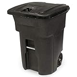 This trash can features a unique locking lid with steel-bolt hinges to keep the lock in place. The trash can is recyclable and has wheels.