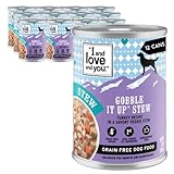 This grain-free canned dog food comes in five stew recipes: Beef Booyah, Lambarama, Clucking Good (Chicken), Gobble It Up (Turkey), Moo Moo Venison (Cow/Venison). This is designed to be a complete and balanced food for your dog and is designated as allergy safe.