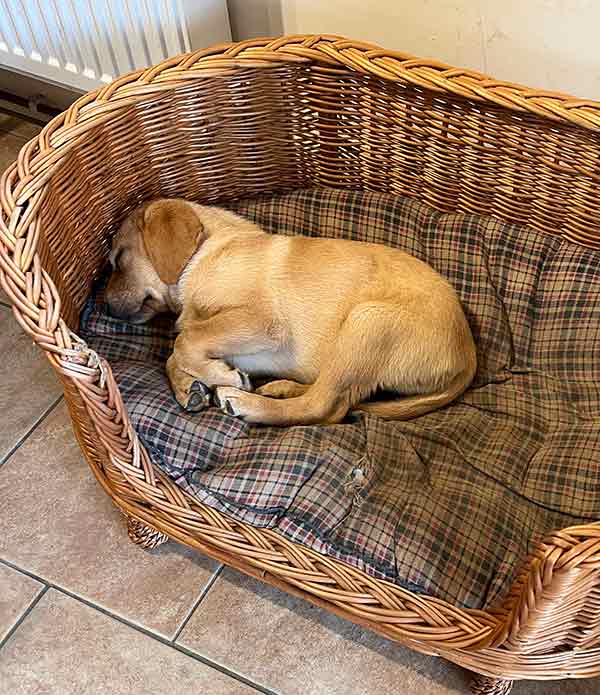 Hemi, chocolate adorable, has a den in the space under the stairs which we still choose at this time (she is 7 months old) to secure shut with a mesh door so it acts as a crate. We have recently extended it into the under stairs cupboard so she has ample room as she grows to stand, curl up, stretch out ..and everything in between. Although she dozes on the sofa, I know the den provides her with quality downtime and deep sleep. I am not sure she would have had so much of this otherwise as she is pretty keen to be part of everything most of the time 😉