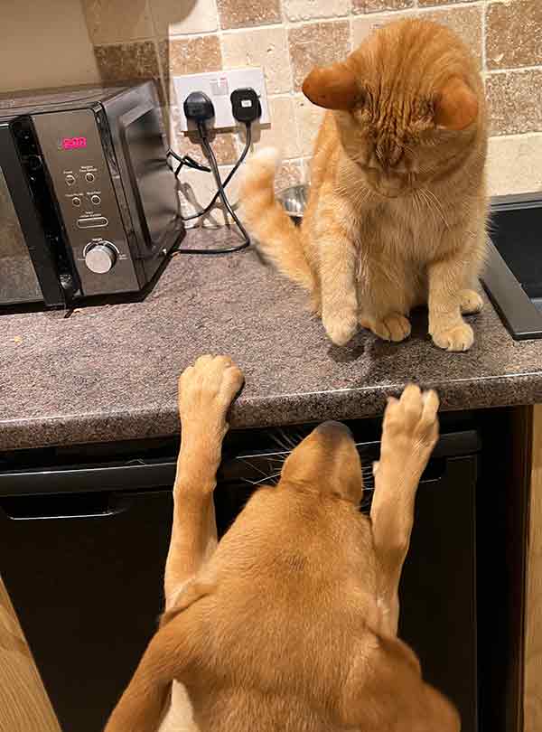 Billy the cat knows she is still a puppy and keeps his mittens on when telling her off!