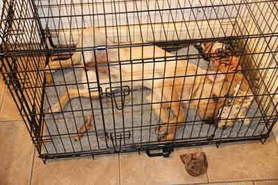 Bonnie still sleeps in a crate while the other dogs are loose.